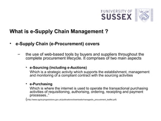 E-supply chain management in the government sector involves using web-based tools to manage the procurement lifecycle electronically. This includes e-sourcing to establish contracts online and e-purchasing to requisition, authorize, order, receive, and pay for items electronically. E-procurement provides benefits like reduced costs, transparency, and a smaller environmental footprint. However, some suppliers and groups may refuse to participate electronically, requiring dual paper and electronic systems. E-procurement also may not be suitable for all procurement like complex projects with undefined requirements.