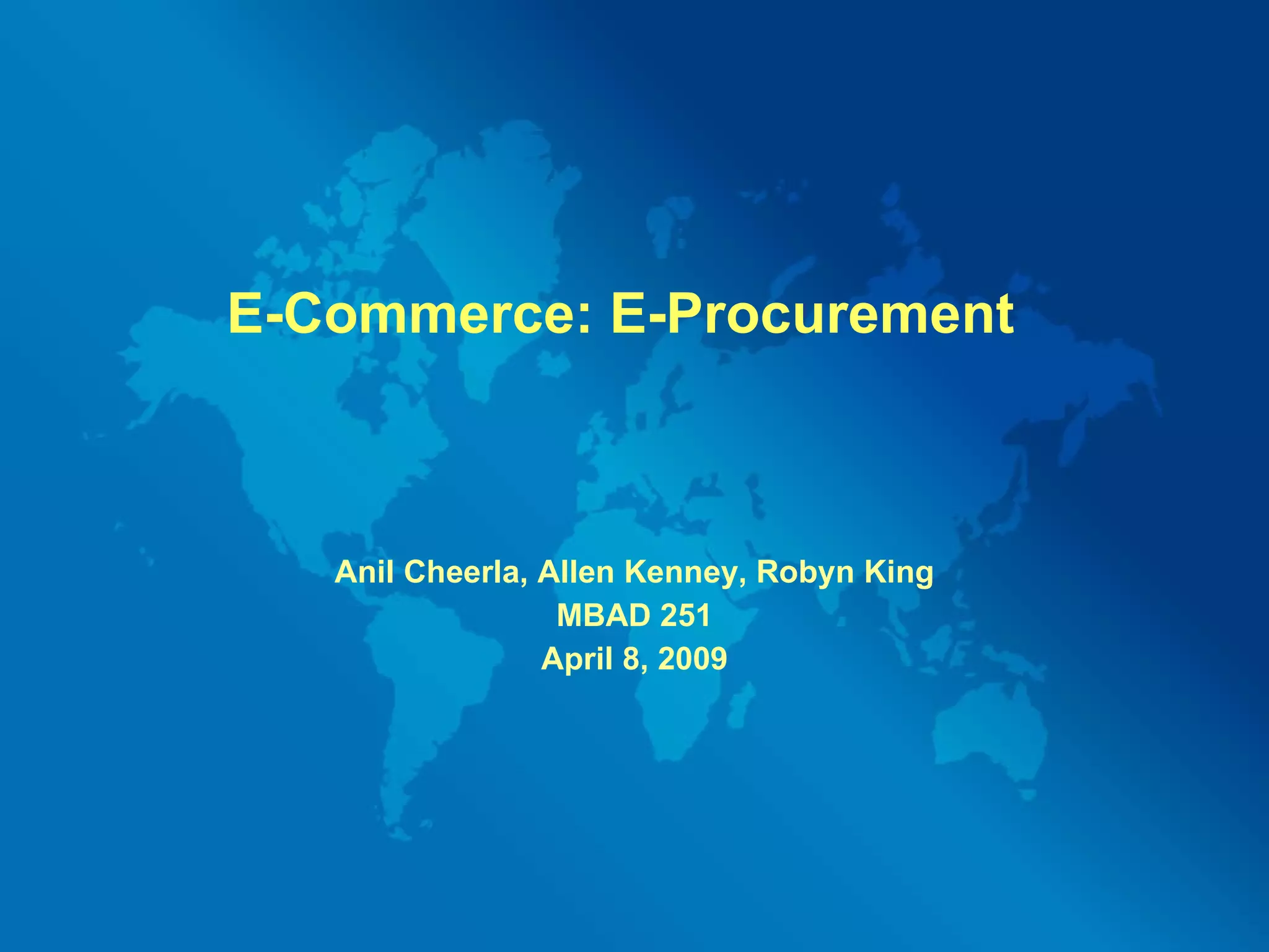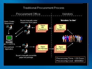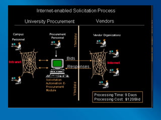 E-procurement refers to the electronic acquisition of goods and services for organizations using the internet. It involves the transactional aspects of requisitioning, authorizing, ordering, receipting and payment processes. Main types of e-procurement include e-sourcing, e-tendering, e-informing, and web-based ERP systems. E-procurement provides benefits such as cost savings, control over maverick spending, improved information flow between buyers and suppliers, and increased buying power. However, concerns include security risks with new systems, transition costs, compatibility with supplier technologies, and ensuring employee skills.