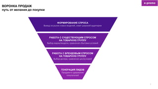 Документ описывает воронку продаж в интернете и инструменты performance-marketing, включая формирование спроса и генерацию лидов через различные рекламные платформы. Приведены стратегии таргетинга, динамического ретаргетинга и инструменты для анализа, такие как Google Analytics и Яндекс.Метрика. Также рассматриваются форматы и модели оплаты интернет-рекламы, включая CPA, CPC, и CPM в условиях стратегического маркетинга.