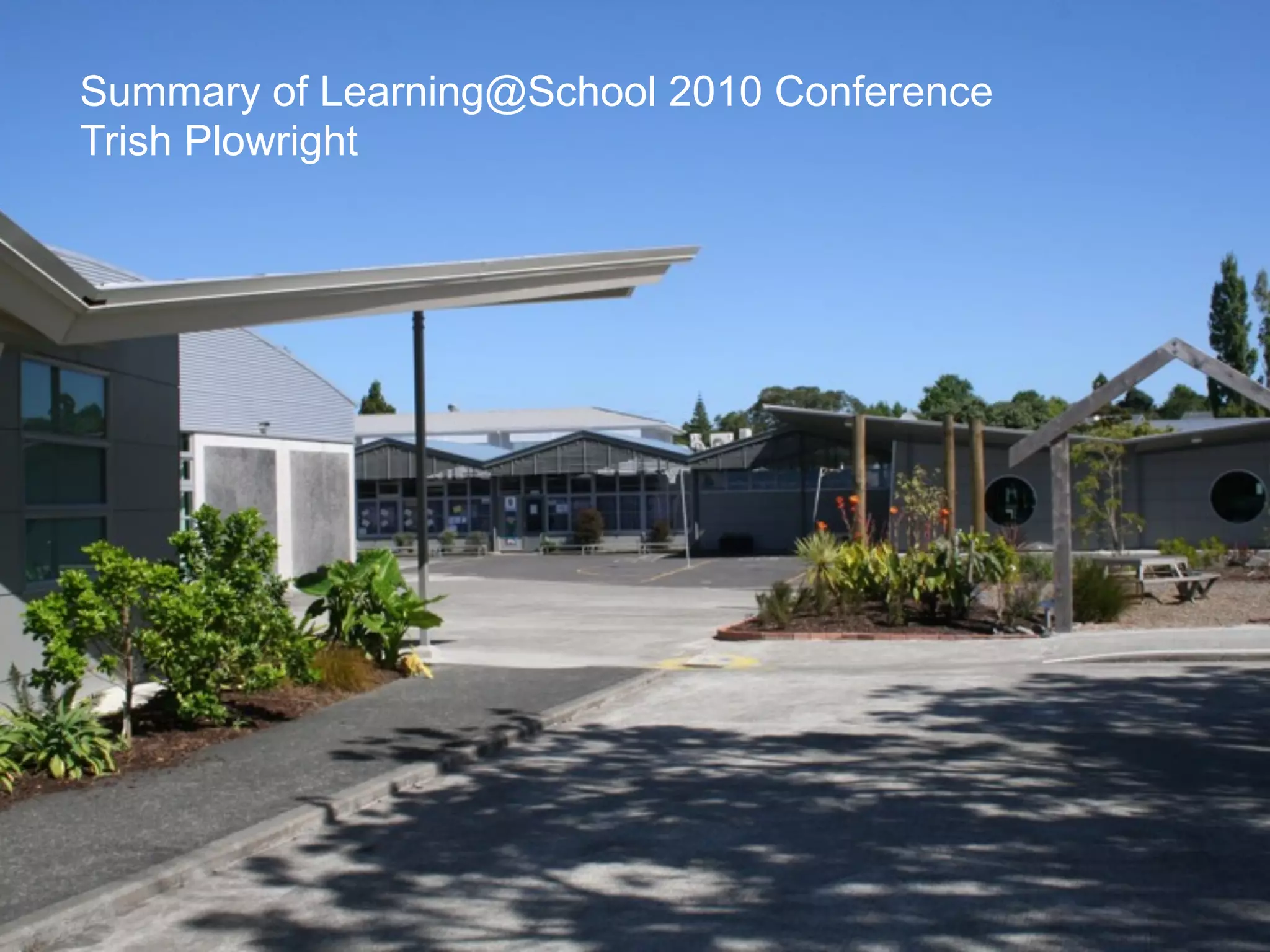 The document summarizes several presentations from the Learning@School 2010 conference. Dr. Helen Barrett defined an e-portfolio as a collection of digital materials that demonstrate a learner's experiences and achievements. E-portfolios can provide structured recording of learning and include various digital files. The conference discussed using e-portfolios to help students become self-regulated learners and provide evidence of learning and next steps. Surveys found parents did not view portfolios often and consistency across the school was needed. Other sessions covered inquiry learning models and action research done at the school.