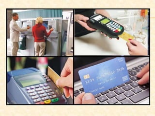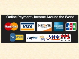 This document discusses various electronic payment methods. It begins by defining e-payments and noting they can take many forms beyond just online transactions. It then covers traditional methods like cash, checks and credit/debit cards. Different payment options are selected based on factors like convenience, traceability, and fraud protection. Credit cards are explained in detail, outlining their business model. Requirements for e-payment methods include enabling payments while preventing fraud and ensuring privacy and scalability. Pros and cons of e-payments are provided. Various specific e-payment options are then outlined, including digital currency, e-wallets, peer-to-peer payments, smart cards, and micro-payments. Credit card fraud and ways to limit it are