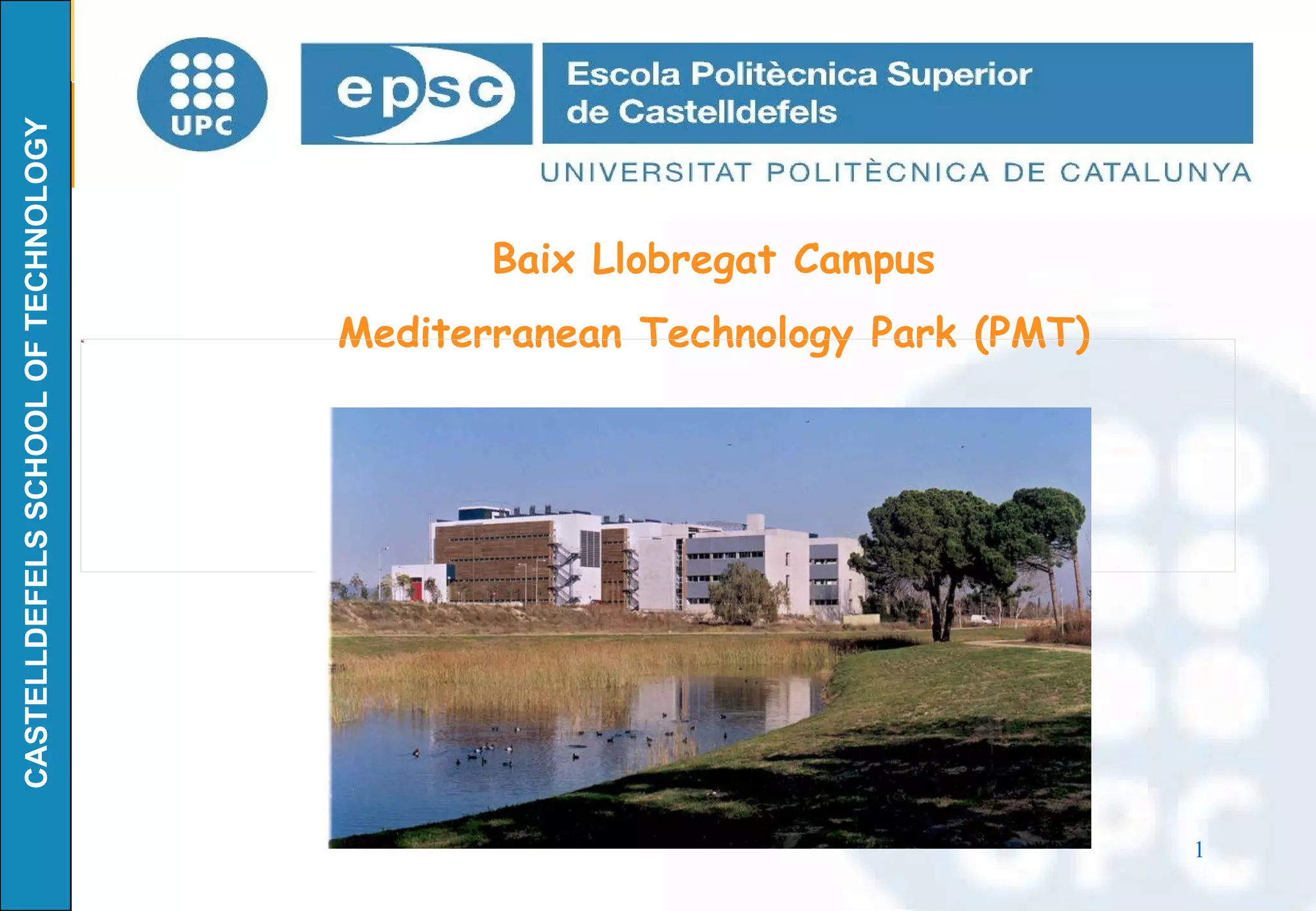 The document provides an overview of the Baix Llobregat Campus Mediterranean Technology Park (PMT), which aims to promote research, development, innovation, and technology transfer through collaboration between the UPC's EPSC school, research centers, and companies. The PMT campus includes facilities for EPSC students and researchers as well as specialized companies in fields like ICT, aeronautics, and agriculture. It also includes several research institutes focusing on technologies relevant to EPSC's academic fields.