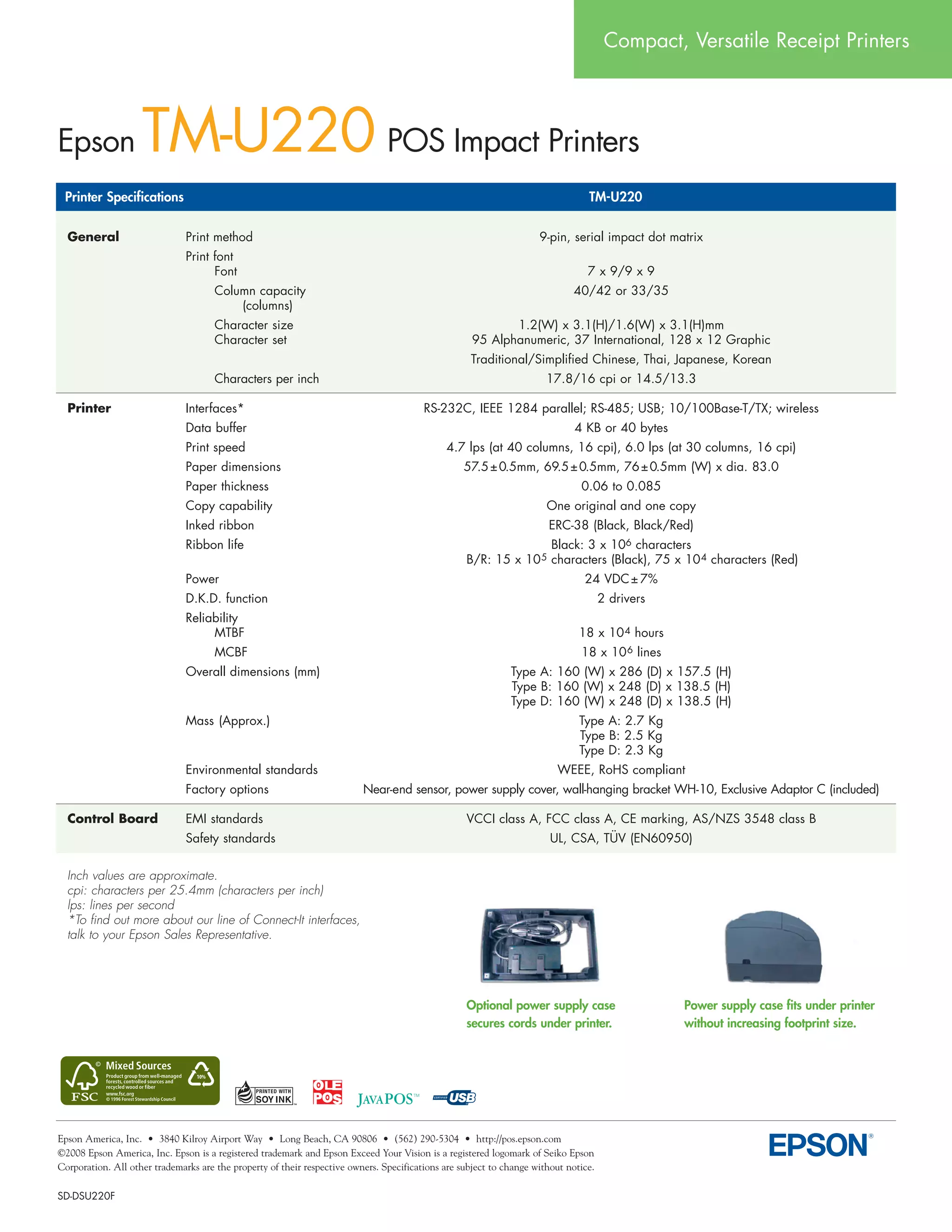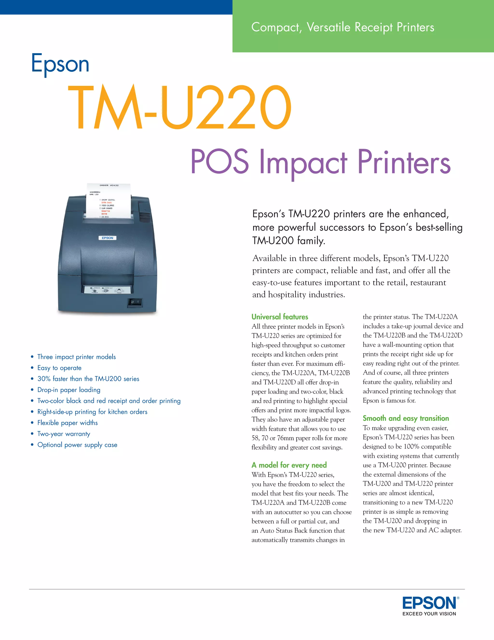 The document summarizes Epson's TM-U220 series of compact receipt printers. The three printer models - TM-U220A, TM-U220B, and TM-U220D - are 30% faster than Epson's previous TM-U200 series. They offer drop-in paper loading, two-color printing, adjustable paper widths, and compatibility with existing TM-U200 systems. The different models provide options like an autocutter, wall-mounting, and a take-up journal device. The TM-U220 series provides reliable, high-speed receipt and order printing for retail and hospitality businesses.