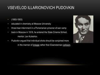 This document provides information on three influential Soviet filmmakers and theorists of montage: Vsevelod Pudovkin, Lev Kuleshov, and Dziga Vertov. It discusses their views and experiments with montage as an editing technique. Pudovkin argued that individual shots should be combined through linkage rather than collision to resemble how the human mind perceives information. Kuleshov studied American montage and conceived of an approach based on the "creative geography/anatomy" of editing. Vertov was a proponent of Marxist cinema who sought to use the camera to reveal the invisible and considered sound an important part of the dialectic power of cinema.