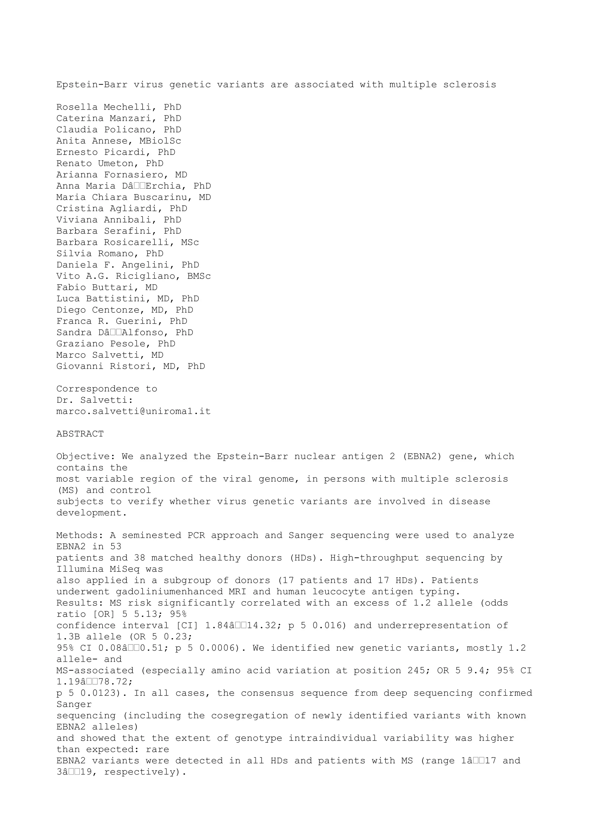 The study investigates the association between Epstein-Barr virus (EBV) genetic variants, specifically the EBNA2 gene, and multiple sclerosis (MS). Results indicate a significant correlation between the presence of certain EBV alleles (1.2 associated with MS and 1.3b underrepresented in patients) and MS development. The findings suggest that EBV contributes to MS risk, emphasizing the need for further research on its pathogenic mechanisms.