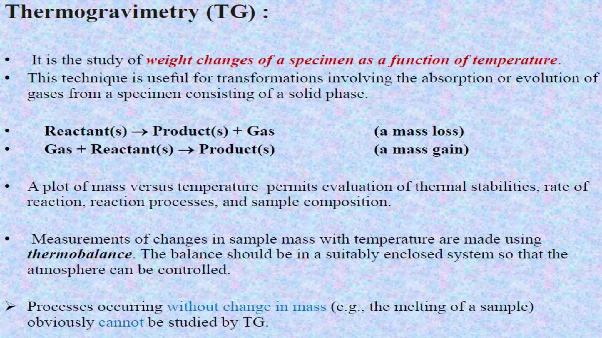 Thermogravimetric analysis (TGA) is introduced as a technique to measure the changes in mass of a material as it is heated. Key points made in the document include: