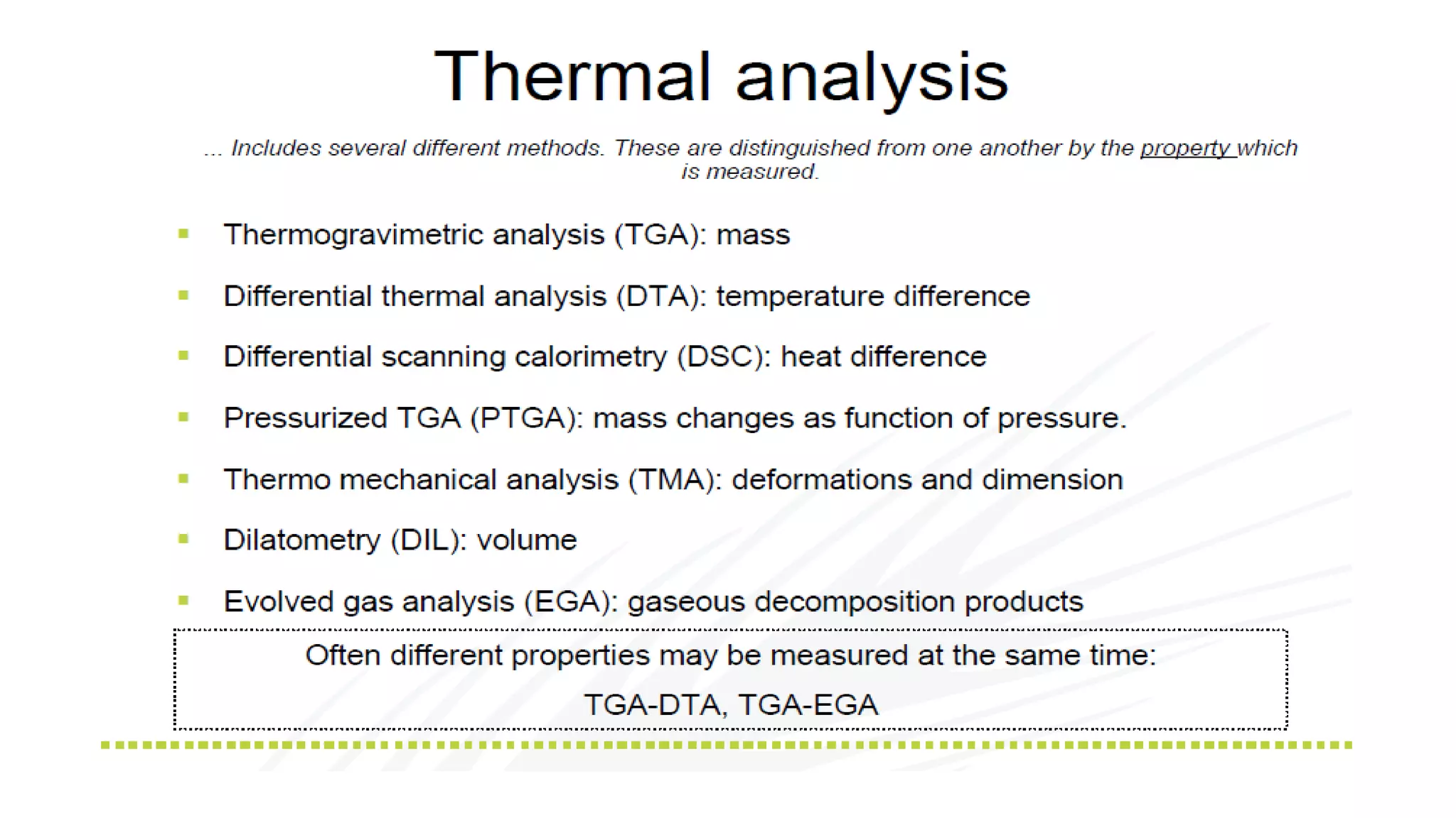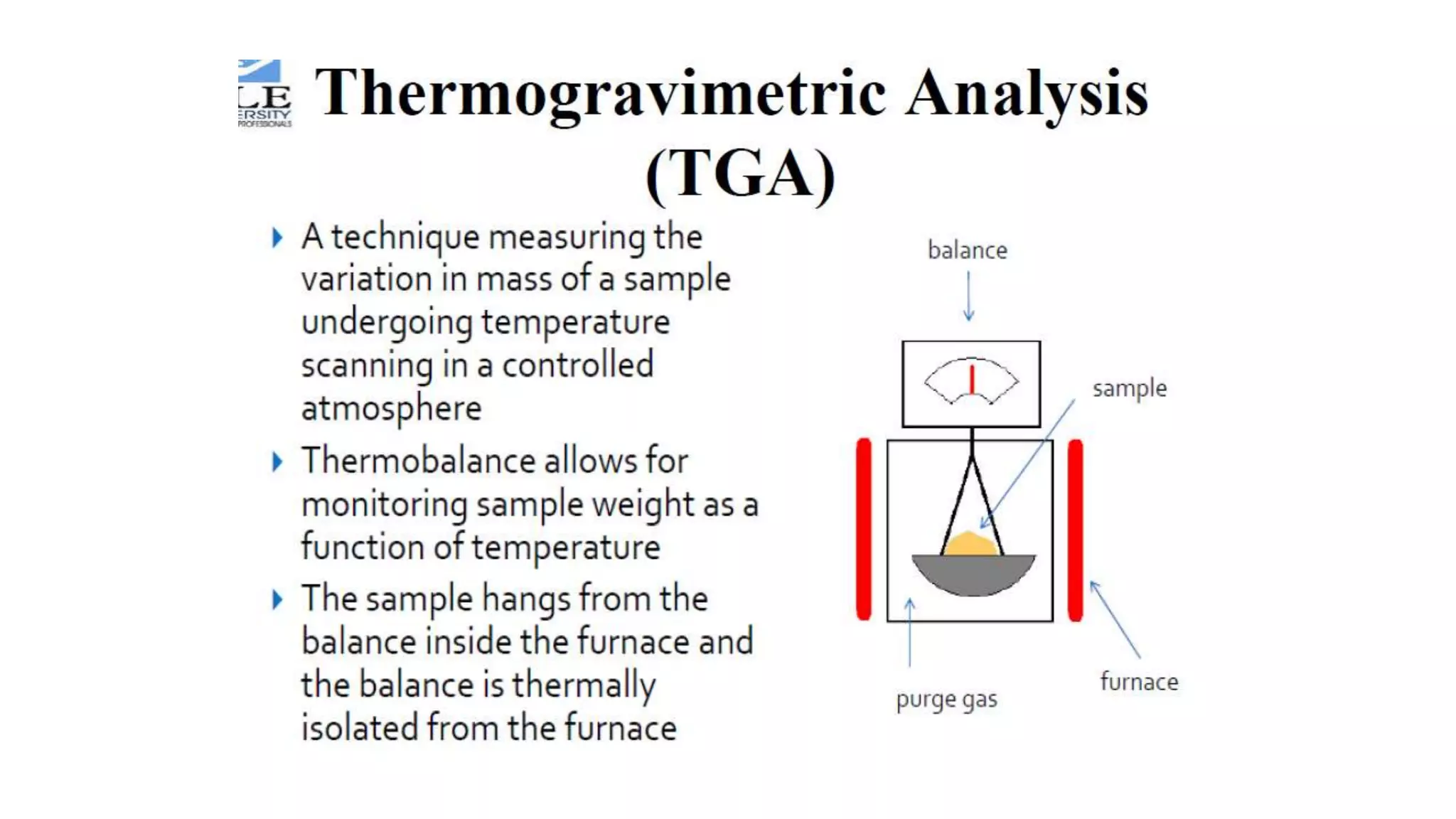 - TGA is commonly used to assess the thermal stability and determine the composition of polymers. It measures the mass of a sample as it is heated in a controlled atmosphere.