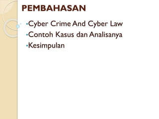 Dokumen ini membahas tentang cyber crime dan cyber law, termasuk definisi kejahatan siber dan analisis kasus pencurian uang nasabah bank yang terjadi melalui internet banking palsu. Kasus yang disoroti melibatkan berbagai nasabah yang kehilangan saldo mereka secara misterius, yang diduga diakibatkan oleh tindakan penipuan. Pelaku dapat dikenakan sanksi berdasarkan berbagai pasal di Kitab Undang-Undang Hukum Pidana.