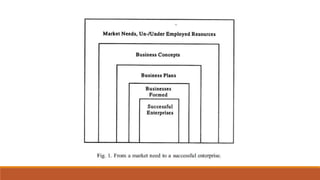 The document discusses entrepreneurial opportunity identification. It defines an entrepreneur as someone who perceives opportunities, organizes resources, and comes up with new ideas. Entrepreneurial startups bring innovative, value-creating, and growth-oriented products or services to the marketplace. Opportunities can arise from observing changes in the environment like technology, recognizing unmet customer needs, or finding solutions to problems. The key is identifying gaps in the existing market that present opportunities.