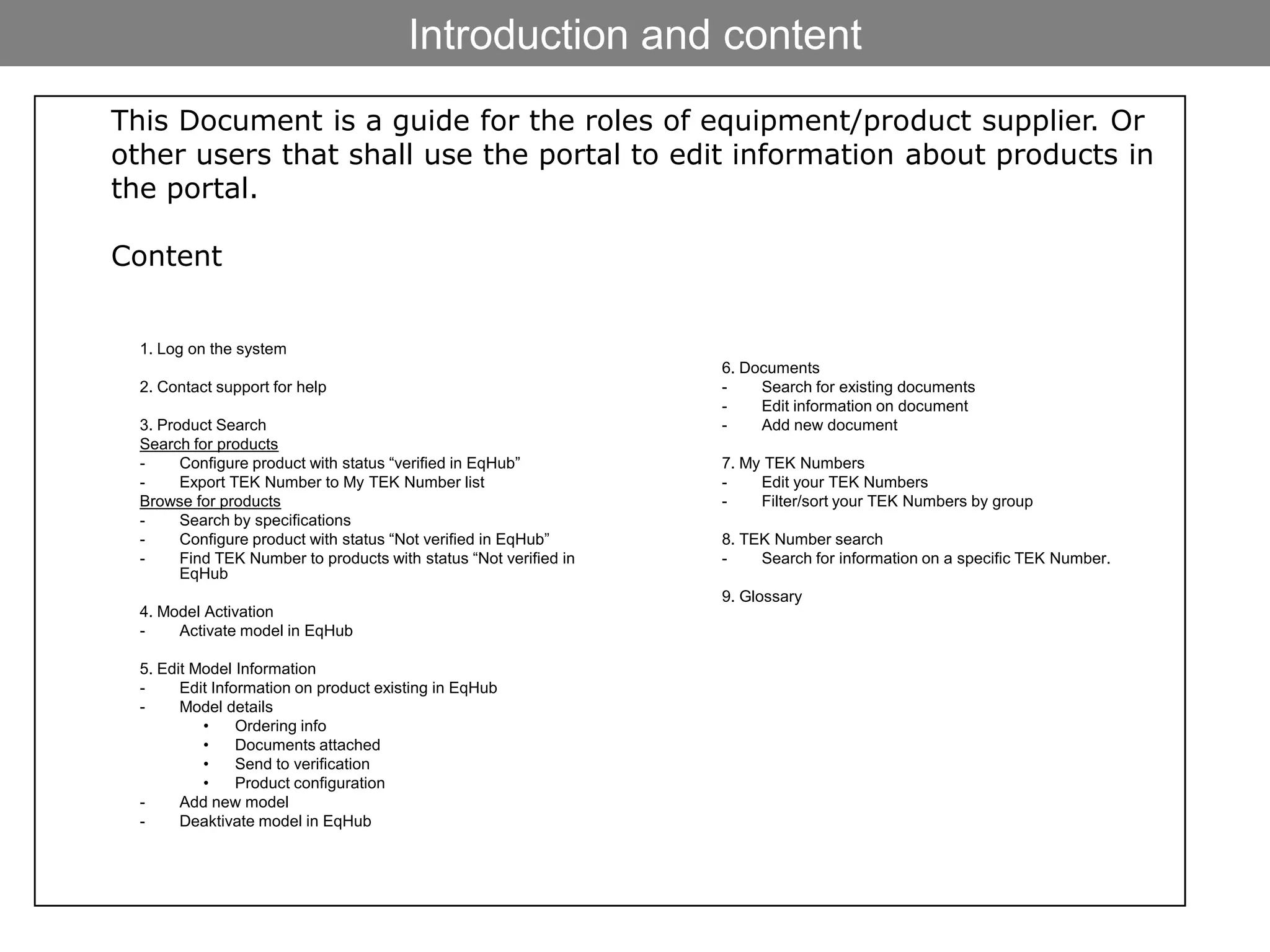 1. The document provides guidance for equipment/product suppliers and other users to edit information about products in the EqHub portal.
