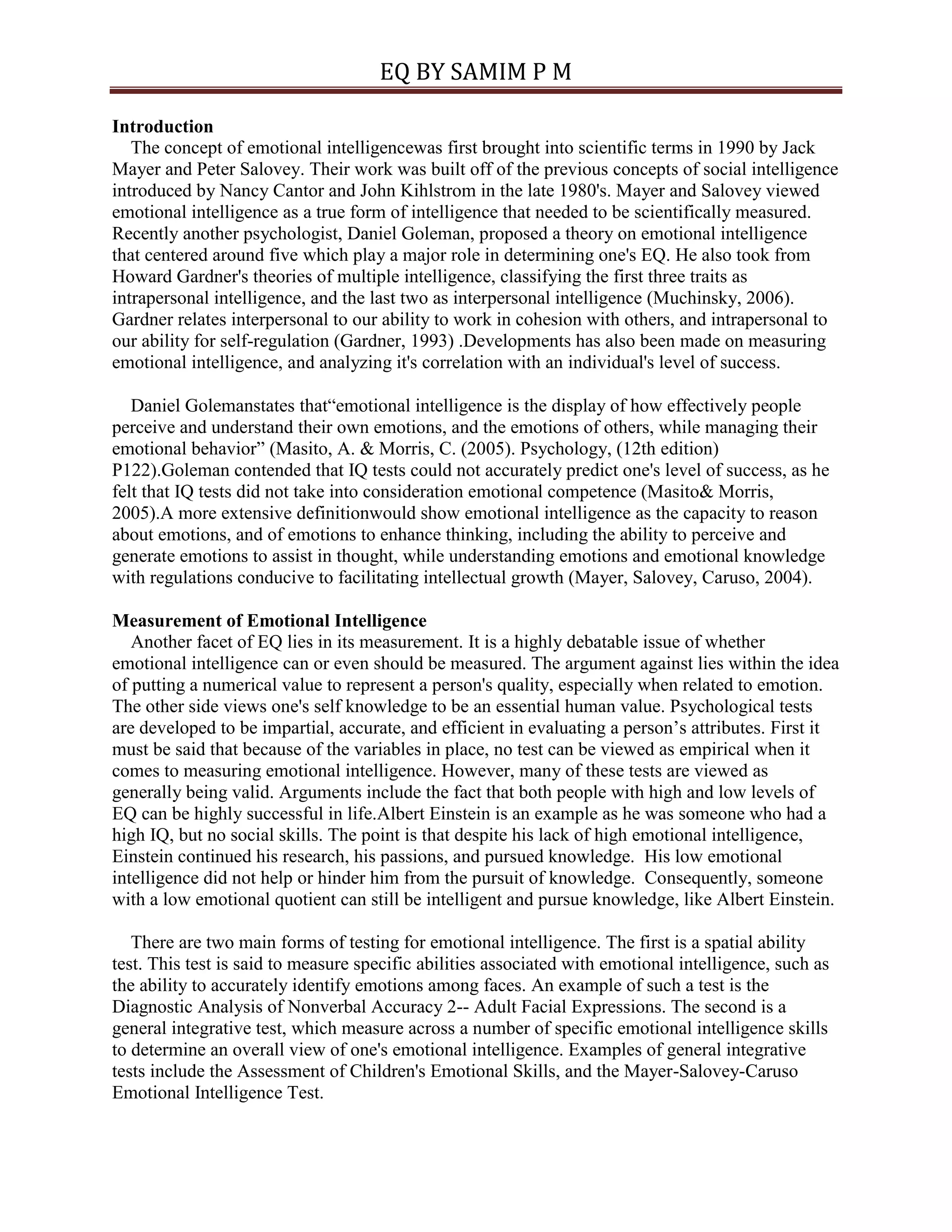 Emotional intelligence was first defined scientifically in 1990 by Mayer and Salovey, building on prior concepts. Goleman later proposed it involves five traits that determine one's EQ. Emotional intelligence involves self and social awareness and management. It is debated whether EQ can be accurately measured, though tests do exist to assess specific skills or provide an overall assessment. While EQ may help predict some life outcomes, it does not determine success on its own, and high IQ individuals like Einstein had low EQ without hindrance. EQ is significant for social and workplace interactions but is not a sole predictor of life outcomes and has limitations as a concept.