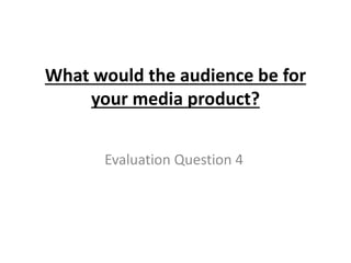 The document discusses the target audience for a media product. It would target working class people ages 16-21, as this large demographic enjoys music the most during these years. Specifically, it may focus on 17 year olds, who research shows listen to the most rap. The target audience would have a relaxed lifestyle, as rap is about relaxation, and the magazine would help them keep up with the genre. A range of ethnic groups would be depicted in the magazine to reflect the diversity of those who enjoy rap music.