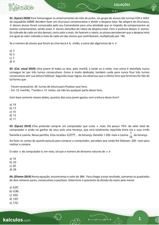 The document is a Portuguese language practice exam with 20 multiple choice questions about solving equations. The questions cover topics like solving systems of equations, finding the number of solutions to an equation based on given parameters, using equations to solve word problems about groups of people and costs, and analyzing properties of equations like number of real or integer solutions.