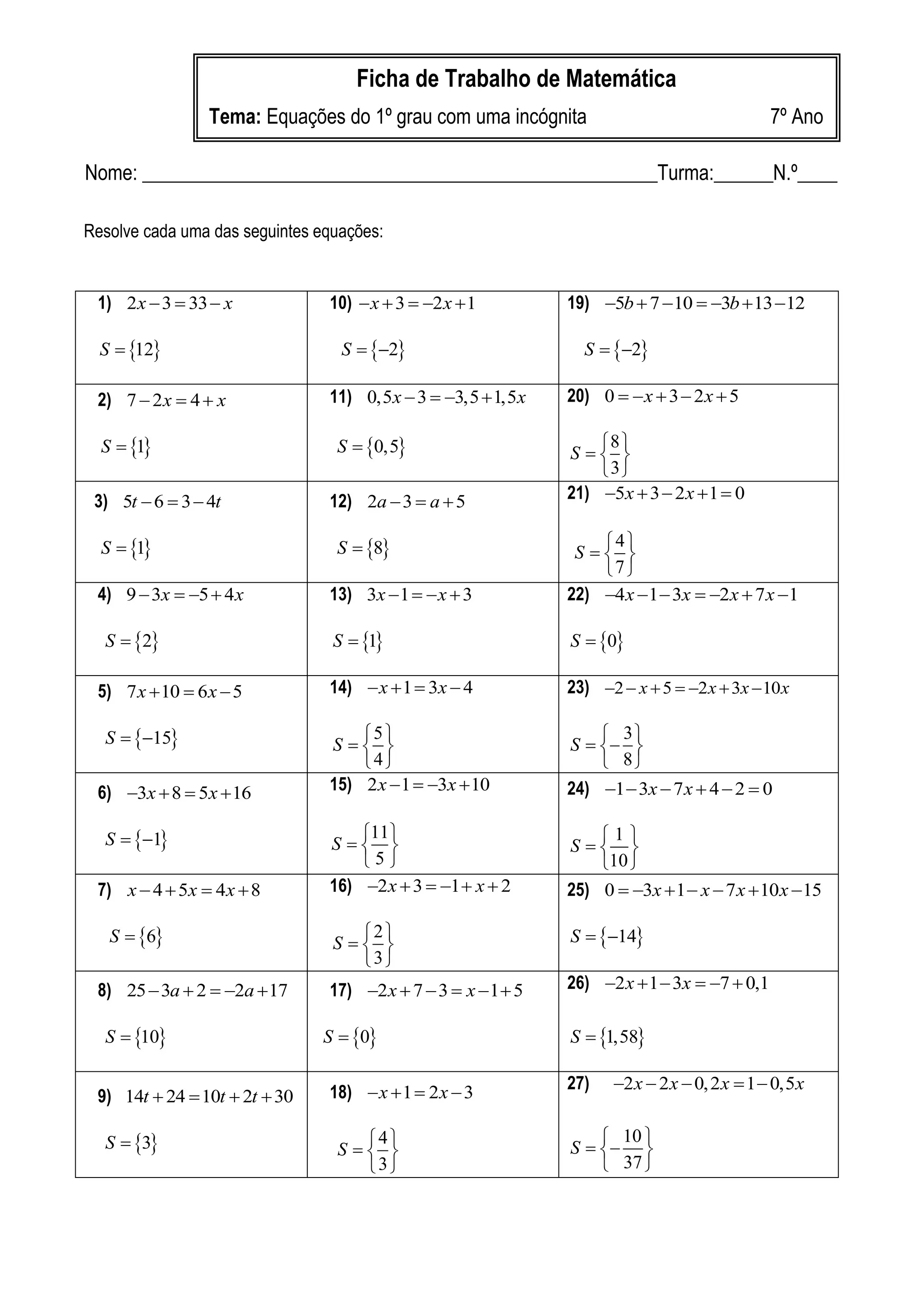 de Matemática Tema: Equações do 1º grau com uma incógnita 7º Ano Nome: ____________________________________________________Turma:______N.º____ Resolve cada uma das seguintes equações: 1) 2 x 3 33 x 10) x 3 2 x 1 19) 5b 7 10 3b 13 12 S 12 S 2 S 2 2) 7 2 x 4 x 11) 0,5x 3 3,5 1,5x 20) 0 x 3 2 x 5 S 1 S 0,5 8 S 3 3) 5t 6 3 4t 12) 2a 3 a 5 21) 5x 3 2 x 1 0 S 1 S 8 4 S 7 4) 9 3x 5 4 x 13) 3x 1 x 3 22) 4 x 1 3x 2x 7 x 1 S 2 S 1 S 0 5) 7 x 10 6 x 5 14) x 1 3x 4 23) 2 x 5 2 x 3x 10x S 15 5 S 3 S 4 8 6) 3x 8 5x 16 15) 2 x 1 3x 10 24) 1 3x 7 x 4 2 0 S 1 11 1 S S 5 10 7) x 4 5x 4x 8 16) 2 x 3 1 x 2 25) 0 3x 1 x 7 x 10 x 15 S 6 2 S S 14 3 8) 25 3a 2 2a 17 17) 2 x 7 3 x 1 5 26) 2 x 1 3x 7 0,1 S 10 S 0 S 1,58 18) x 1 2 x 3 27) 2 x 2 x 0, 2 x 1 0,5x 9) 14t 24 10t 2t 30 S 3 4 10 S S 3 37
