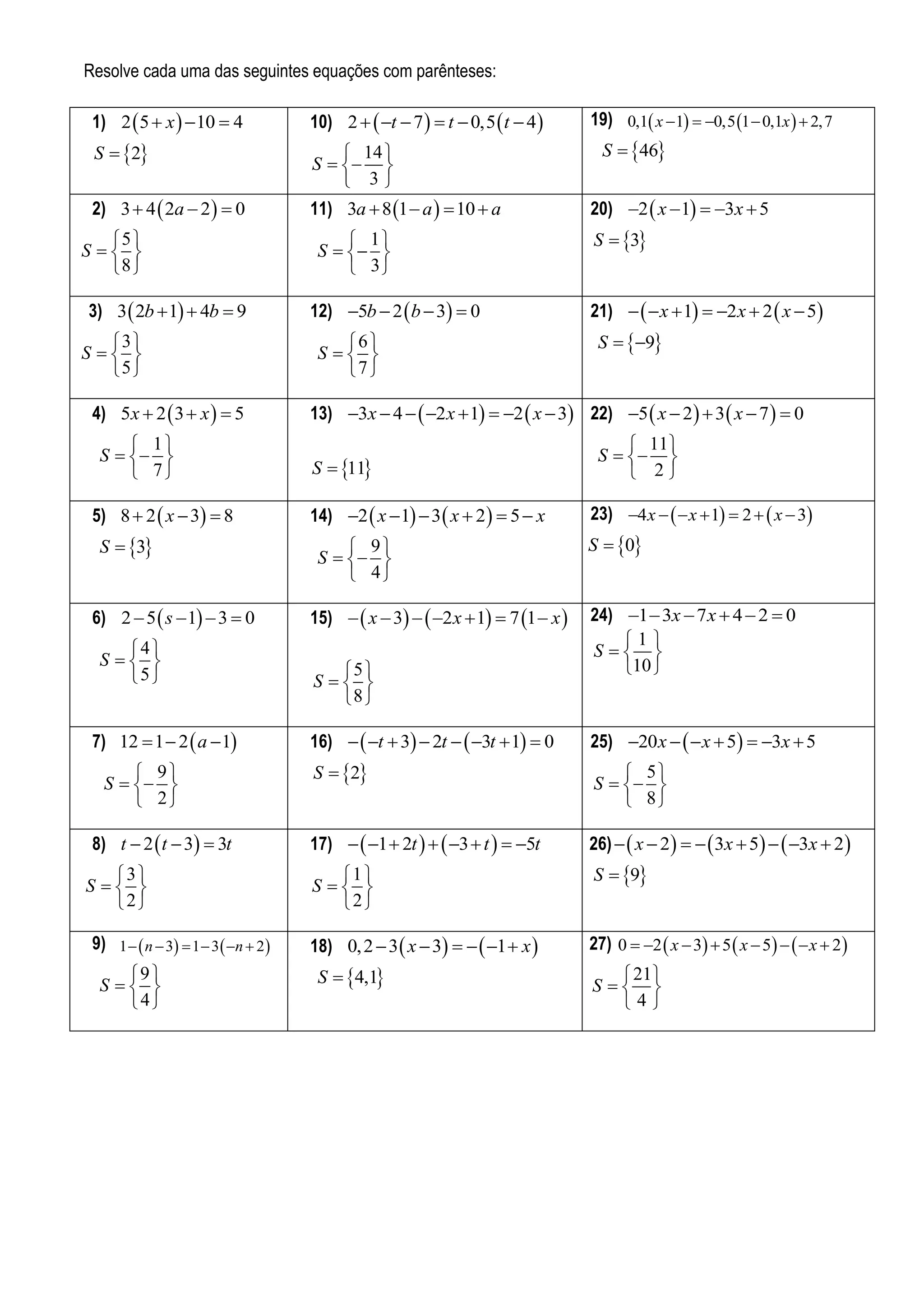 das seguintes equações com parênteses: 1) 2 5 x 10 4 10) 2 t 7 t 0,5 t 4 19) 0,1 x 1 0,5 1 0,1x 2,7 S 2 14 S 46 S 3 2) 3 4 2a 2 0 11) 3a 8 1 a 10 a 20) 2 x 1 3x 5 5 1 S 3 S S 8 3 3 3) 3 2b 1 4b 9 12) 5b 2 b 3 0 21) x 1 2 x 2 x 5 3 6 S 9 S S 5 7 4) 5x 2 3 x 5 13) 3x 4 2 x 1 2 x 3 22) 5 x 2 3 x 7 0 1 11 S S 7 S 11 2 5) 8 2 x 3 8 14) 2 x 1 3 x 2 5 x 23) 4 x x 1 2 x 3 S 3 9 S 0 S 4 6) 2 5 s 1 3 0 15) x 3 2 x 1 7 1 x 24) 1 3x 7 x 4 2 0 4 1 S S 5 5 10 S 8 7) 12 1 2 a 1 16) t 3 2t 3t 1 0 25) 20 x x 5 3x 5 9 S 2 5 S S 2 8 8) t 2 t 3 3t 17) 1 2t 3 t 5t 26) x 2 3x 5 3x 2 3 1 S 9 S S 2 2 9) 1 n 3 1 3 n 2 18) 0, 2 3 x 3 1 x 27) 0 2 x 3 5 x 5 x 2 9 S S 4,1 21 S 4 4