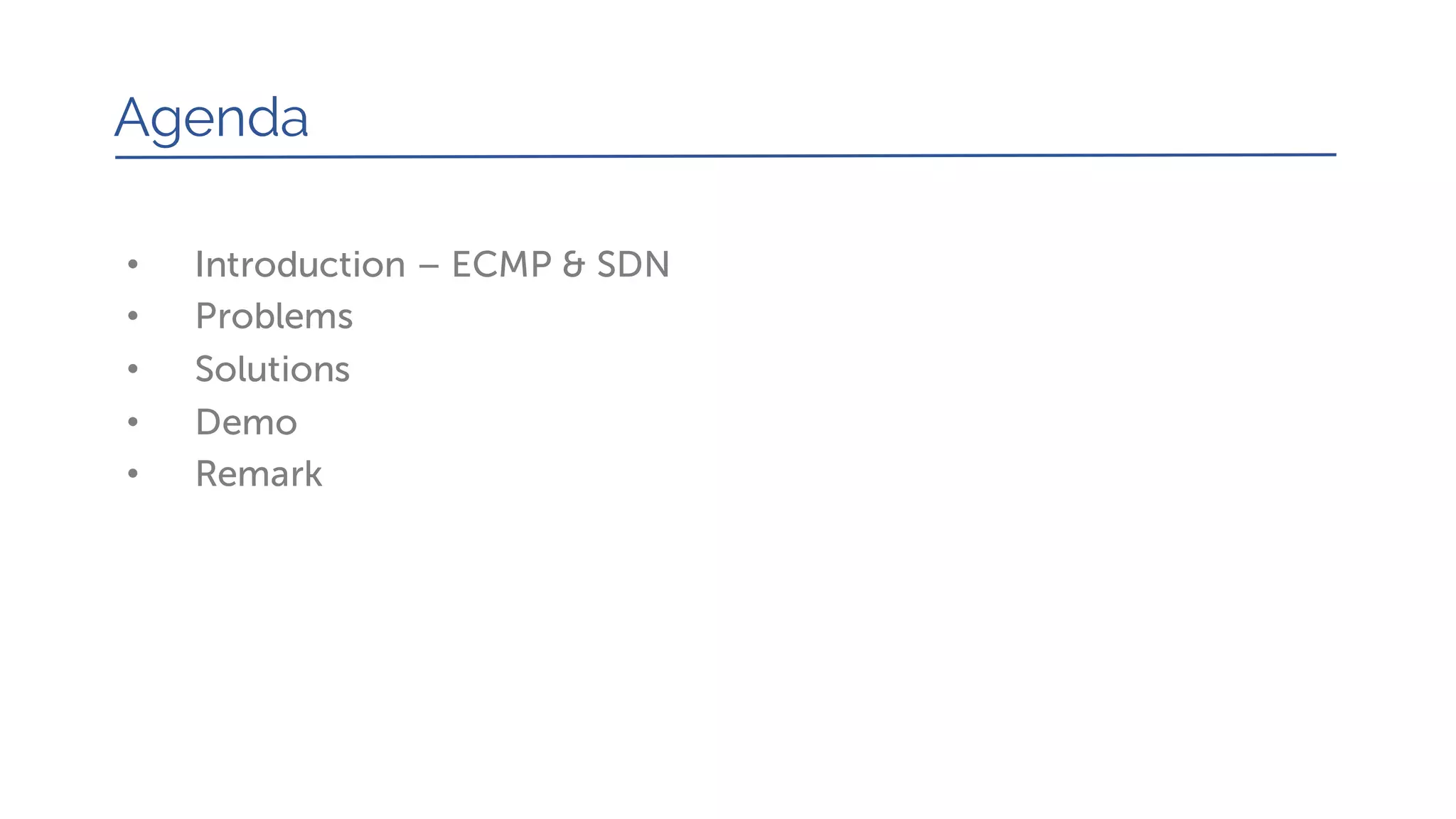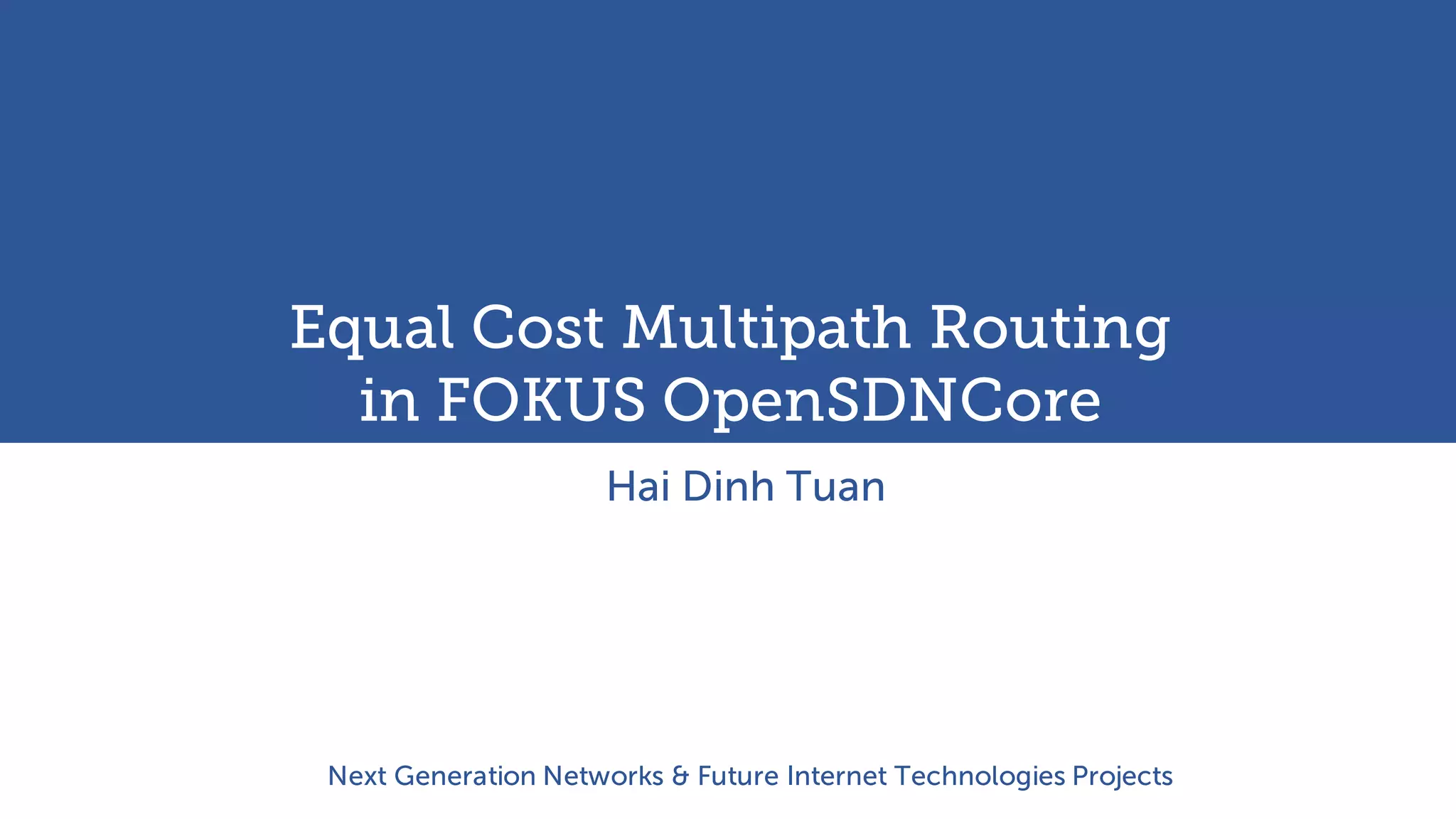 This document discusses implementing equal cost multipath routing (ECMP) in the OpenSDNCore software-defined networking (SDN) controller. It begins with introductions to ECMP and SDN, then outlines problems with routing, communication between controllers and switches, and packet forwarding. It proposes using the arc cutting method to calculate multiple equal cost paths and the OpenFlow FlowMod and GroupMod messages to implement paths on switches. Random and hash-based approaches to packet forwarding across paths are presented and compared. A demo topology is shown, with expected outcomes being successful ECMP implementation, documentation, communication, and experiences gained.
