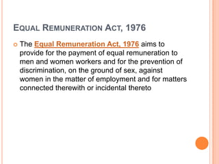 The Equal Remuneration Act of 1976 aims to provide equal pay for equal work for both men and women as mandated by the Indian Constitution. The Act defines remuneration broadly to include basic wages as well as additional payments in cash or kind. It does not apply to laws that provide special treatment to women regarding maternity or retirement terms. Two key court cases are discussed. Garland v British Rail established that travel benefits can constitute pay. Pickstone v Freeman's affirmed that a woman can compare her job to a different man's job when making an equal pay claim.