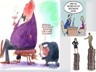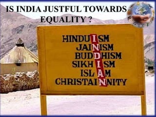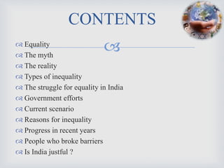 This document discusses equality and inequality in India. It covers types of inequality like gender, income, education, caste/religion. It discusses government efforts to promote equality like constitutional rights and affirmative action. However, inequality still persists in many forms like gender-based abortion, increasing rich-poor gap and lack of safety for women. While progress has been made in recent years through education, reforms and development programs, achieving true equality remains a challenge and work still needs to be done.