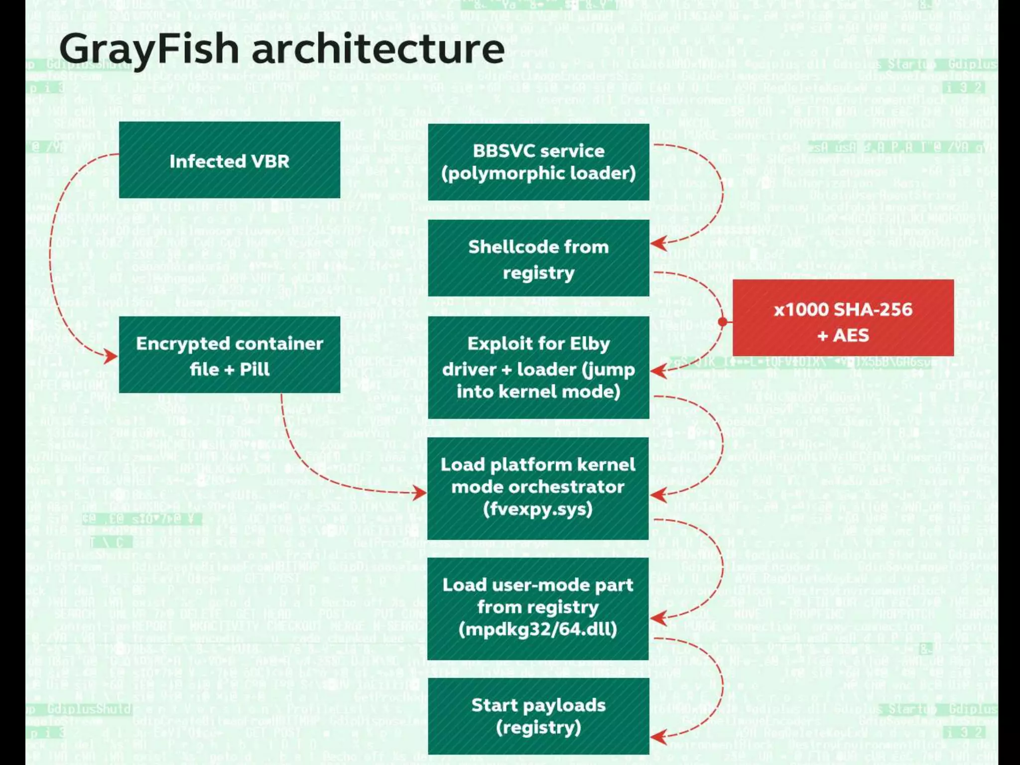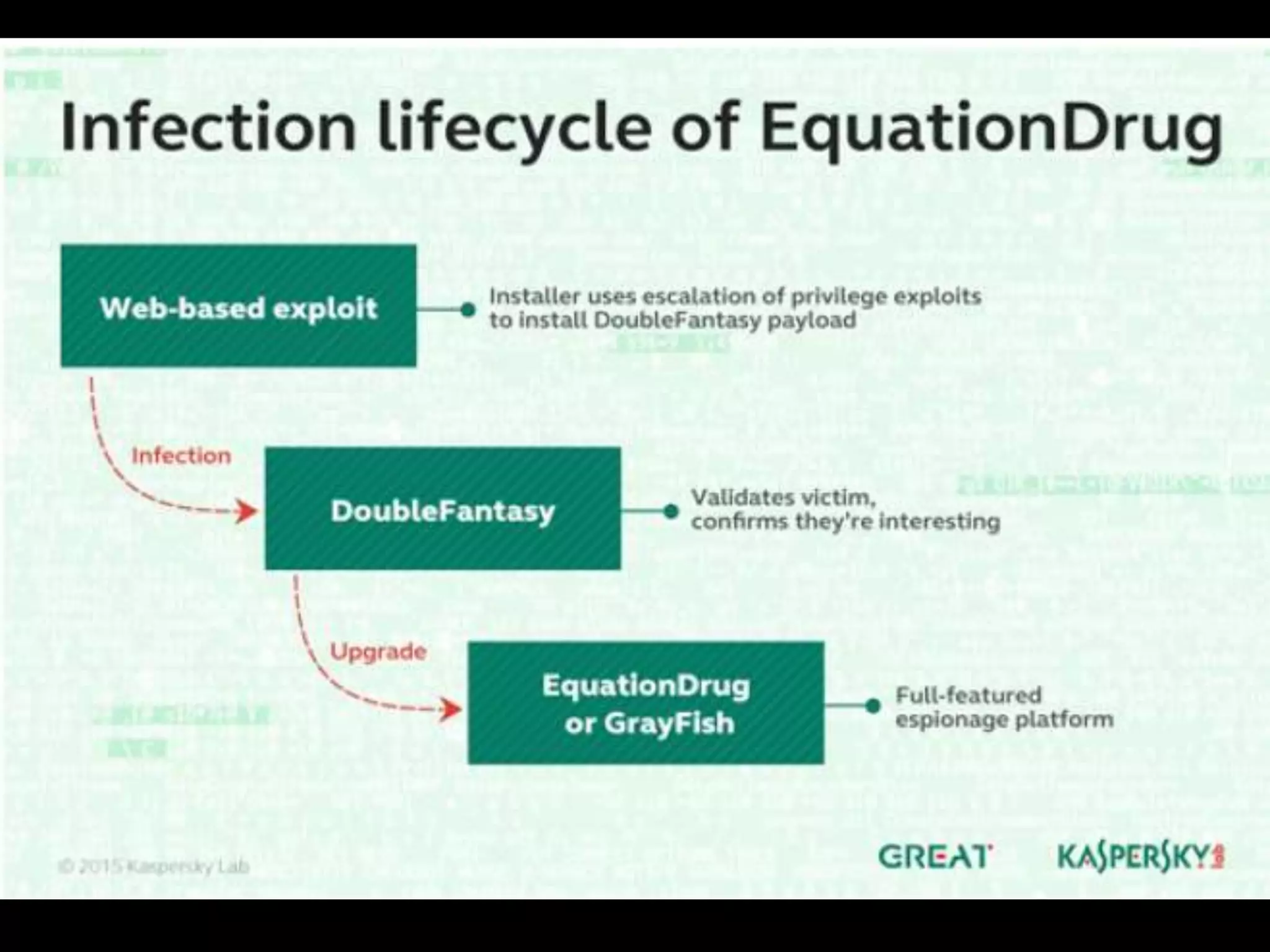 The document discusses the Equation Group, a sophisticated threat actor involved in computer network exploitation since the late 1990s, known for their advanced malware platforms utilizing complex encryption methods. Key malware includes DoubleFantasy, used to validate victims, and EquationDrug and Grayfish, which offer advanced espionage capabilities and persistence mechanisms. The Group employs various methods for infection and has a vast command and control infrastructure across multiple countries.