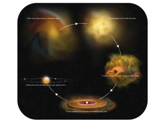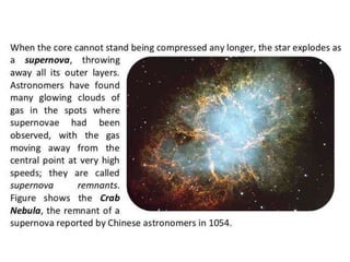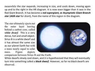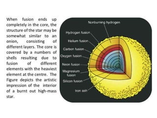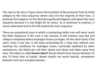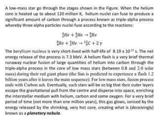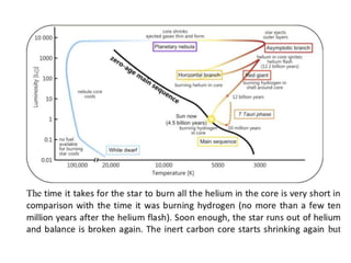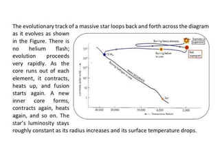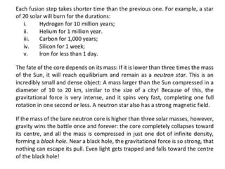 Stars evolve over their lifetime based on their initial mass and composition. Lower mass stars like our Sun spend most of their lifetime stably fusing hydrogen into helium in their cores before expanding into red giants and fusing heavier elements. Higher mass stars have shorter lifetimes as they rapidly fuse heavier elements, eventually ending their lives in dramatic supernova explosions that seed the galaxy with heavier elements essential for life.