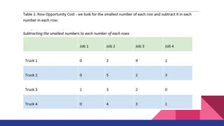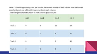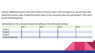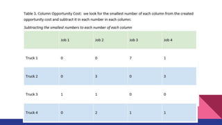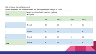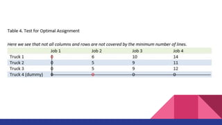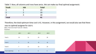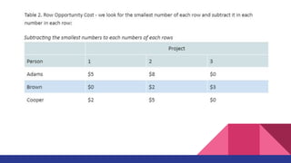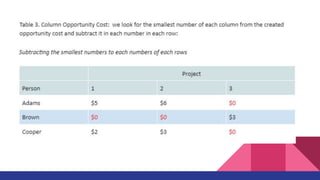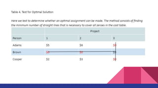 The document discusses the Assignment Method, which allocates organizational resources to tasks in order to optimize revenues by reducing costs and improving efficiency. It describes using the Hungarian Method and a cost table to assign three repair projects to three repair persons with different wage costs, with the goal of minimizing total costs. The document provides examples of balanced and unbalanced assignment problems and their solutions.