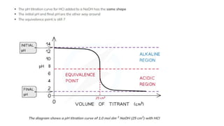 •As the volume of strong alkali (NaOH) added increases, the pH of the HCl