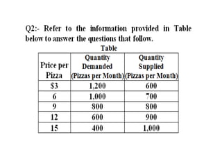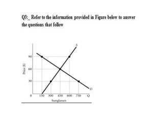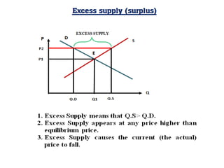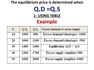 This document summarizes a lecture on market equilibrium price and quantity. It discusses how equilibrium is reached when quantity demanded (QD) equals quantity supplied (QS), using tables and graphs. The equilibrium price is where the demand and supply curves intersect. Questions and examples are provided to illustrate how equilibrium changes with shifts in demand or supply. For example, if demand or supply increases, the new equilibrium will be a higher quantity and price. The document also shows how to calculate equilibrium mathematically by setting the demand and supply equations equal to each other.