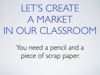 The document introduces the concept of supply and demand equilibrium in a classroom market simulation. Students will propose prices for snack packs and those prices will be used to create a demand schedule. Students will then think like suppliers and choose a price for the snack packs that maximizes sales and profits by matching supply to demand. The market reaches equilibrium when the quantity demanded is equal to the quantity supplied at a certain equilibrium price. Disequilibrium states like surpluses and shortages occur when demand and supply are not equal.