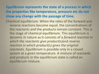 The document explains the concepts of chemical equilibrium, dynamic nature of reactions, and the laws governing equilibrium constants. It discusses various factors affecting equilibrium, including concentration, pressure, temperature, and the role of catalysts and inert gases. Additionally, it outlines Le Chatelier’s principle and summarises its effects on the direction of equilibrium shifts.