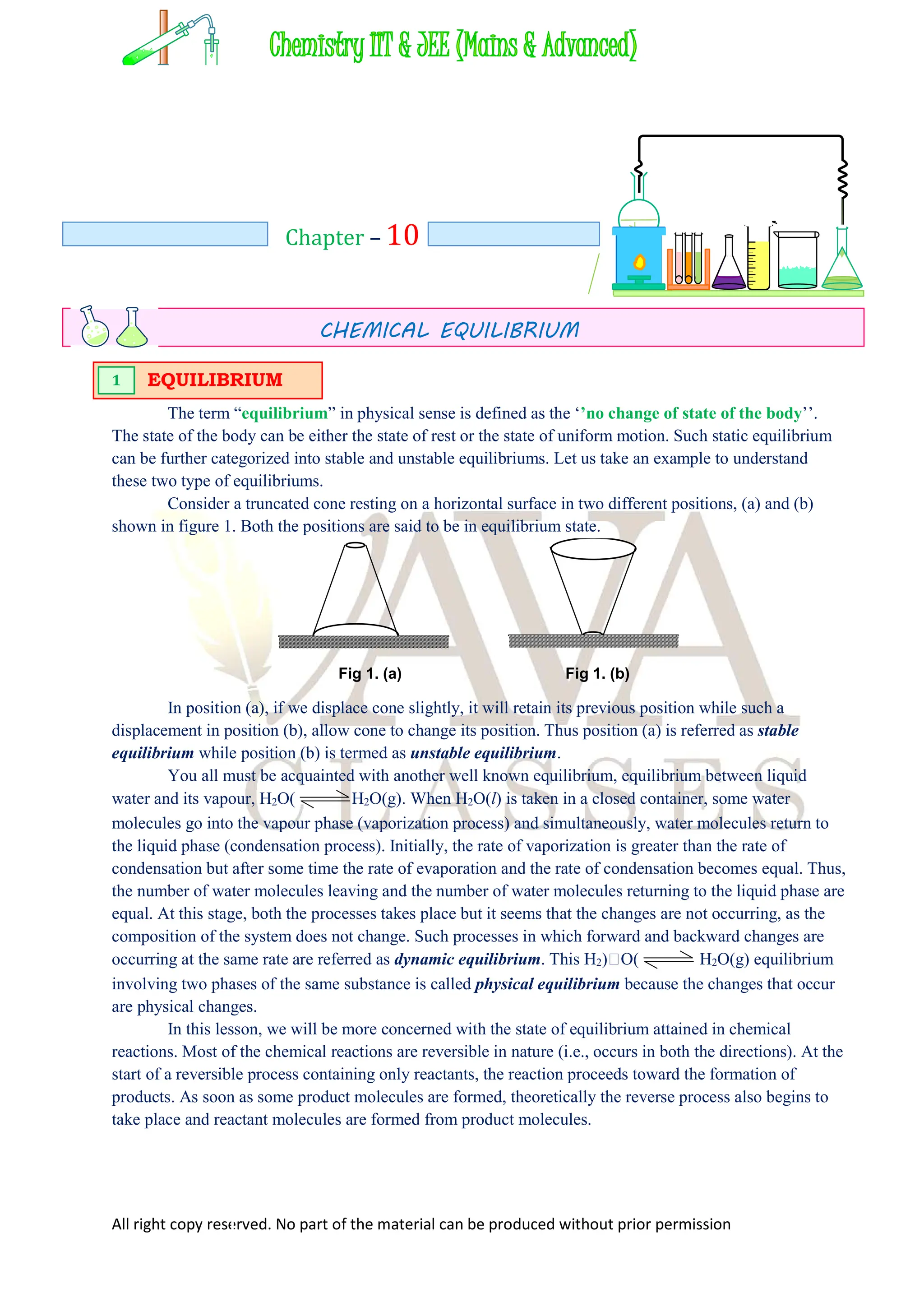 The document discusses the concept of equilibrium in physical and chemical contexts, defining stable and unstable equilibrium and explaining dynamic equilibrium in reversible chemical reactions. It also covers the characteristics of chemical equilibrium, the law of mass action, and the relationships between equilibrium constants for various types of reactions, including how changes in conditions affect equilibrium states. It highlights the importance of understanding reactants and products, as well as the distinctions between homogeneous and heterogeneous equilibria.