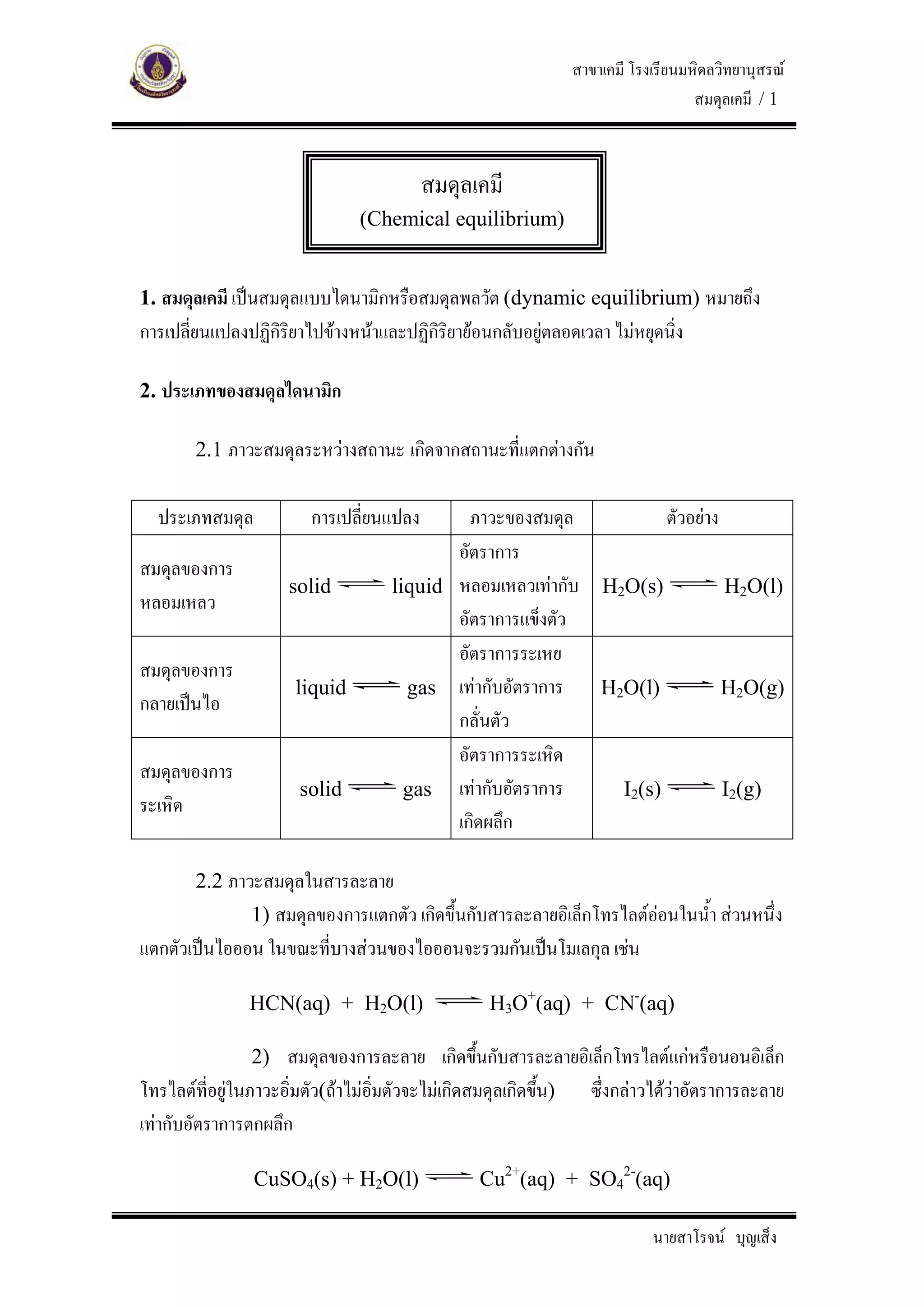 สมดุลเคมี / 1 สมดุลเคมี (Chemical equilibrium) 1. สมดุลเคมี เปนสมดุลแบบไดนามิกหรือสมดุลพลวัต (dynamic equilibrium) หมายถึง การเปลี่ยนแปลงปฏิกริยาไปขางหนาและปฏิกิริยายอนกลับอยูตลอดเวลา ไมหยุดนิ่ง ิ 2. ประเภทของสมดุลไดนามิก 2.1 ภาวะสมดุลระหวางสถานะ เกิดจากสถานะที่แตกตางกัน ประเภทสมดุล การเปลี่ยนแปลง ภาวะของสมดุล ตัวอยาง อัตราการ สมดุลของการ solid liquid หลอมเหลวเทากับ H2O(s) H2O(l) หลอมเหลว อัตราการแข็งตัว อัตราการระเหย สมดุลของการ liquid gas เทากับอัตราการ H2O(l) H2O(g) กลายเปนไอ กลั่นตัว อัตราการระเหิด สมดุลของการ solid gas เทากับอัตราการ I2(s) I2(g) ระเหิด เกิดผลึก 2.2 ภาวะสมดุลในสารละลาย 1) สมดุลของการแตกตัว เกิดขึ้นกับสารละลายอิเล็กโทรไลตออนในน้ํา สวนหนึ่ง แตกตัวเปนไอออน ในขณะที่บางสวนของไอออนจะรวมกันเปนโมเลกุล เชน HCN(aq) + H2O(l) H3O+(aq) + CN-(aq) 2) สมดุลของการละลาย เกิดขึนกับสารละลายอิเล็กโทรไลตแกหรือนอนอิเล็ก ้ โทรไลตที่อยูในภาวะอิ่มตัว(ถาไมอิ่มตัวจะไมเกิดสมดุลเกิดขึ้น) ซึ่งกลาวไดวาอัตราการละลาย เทากับอัตราการตกผลึก CuSO4(s) + H2O(l) Cu2+(aq) + SO42-(aq) นายสาโรจน บุญเส็ง