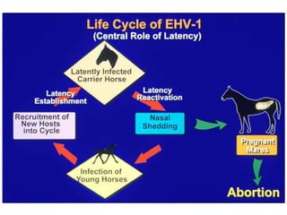 This document provides information on various diseases that affect equines in India. It begins with background on the equine population in India and then lists and describes several important viral diseases (Hendra, equine influenza, equine herpes virus, equine infectious anemia, African horse sickness, equine viral arteritis, West Nile fever, equine encephalitis) and bacterial diseases (glanders, strangles, tetanus, Rhodococcus equi, leptospirosis, botryomycosis). For each disease, it discusses the causative agent, transmission, pathogenesis, clinical signs, lesions, and current status or outbreaks in India. Considerable detail is provided for Hendra virus, equ