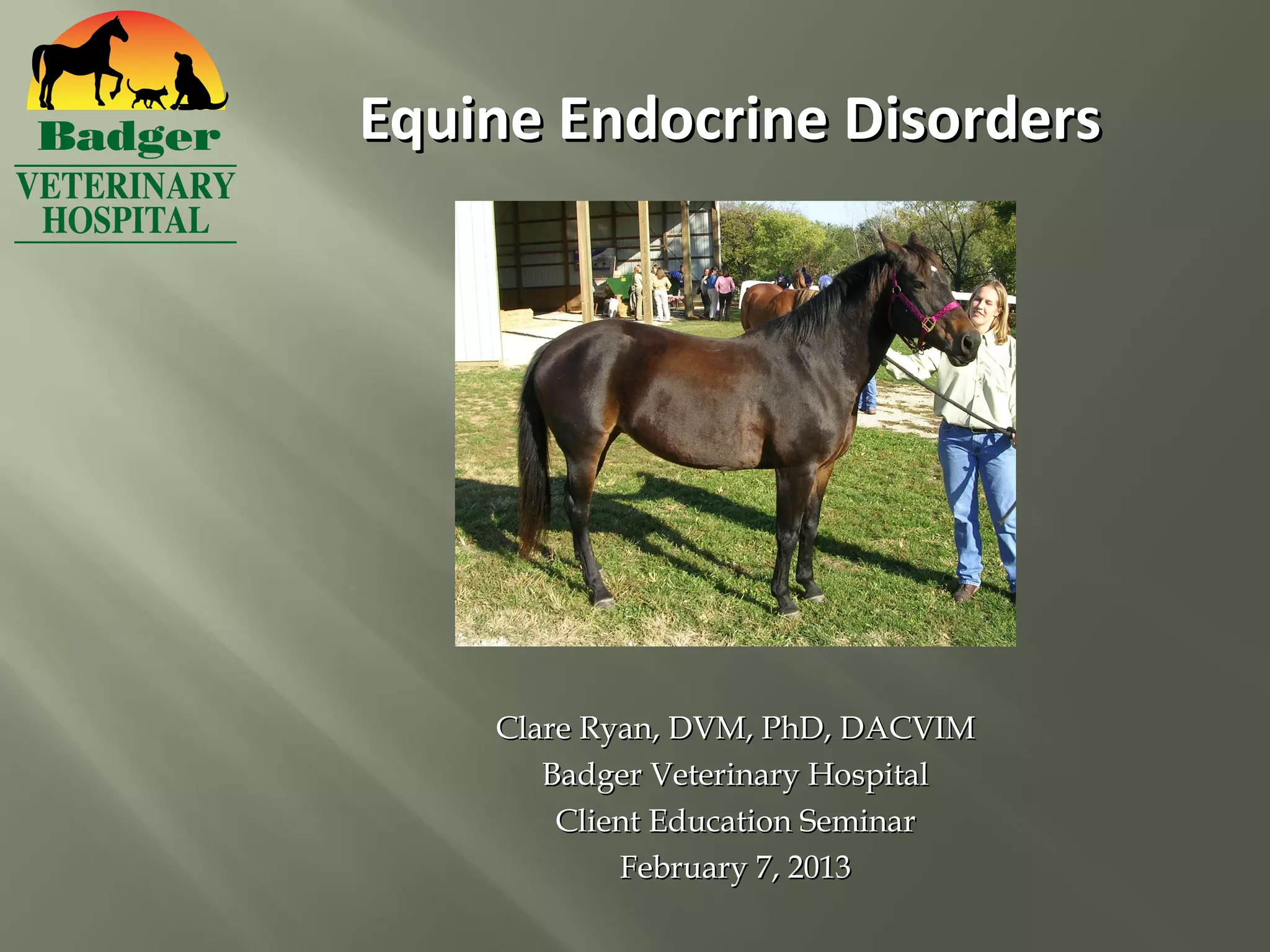 This document summarizes equine endocrine disorders including equine metabolic syndrome (EMS) and equine Cushing's disease (equine pars pituitary intermedia dysfunction or PPID). EMS is characterized by insulin resistance, obesity, and laminitis. It commonly affects ponies, Morgans, and other breeds aged 10-20. Clinical signs include laminitis, reproductive issues, and regional fat deposits. Testing includes insulin/glucose ratios and oral sugar tests. Treatment focuses on weight loss through diet, exercise, and limiting carbohydrates. PPID is a pituitary gland dysfunction causing high cortisol levels. It mainly affects horses over 15 and clinical signs vary but include long hair coat, increased drinking,