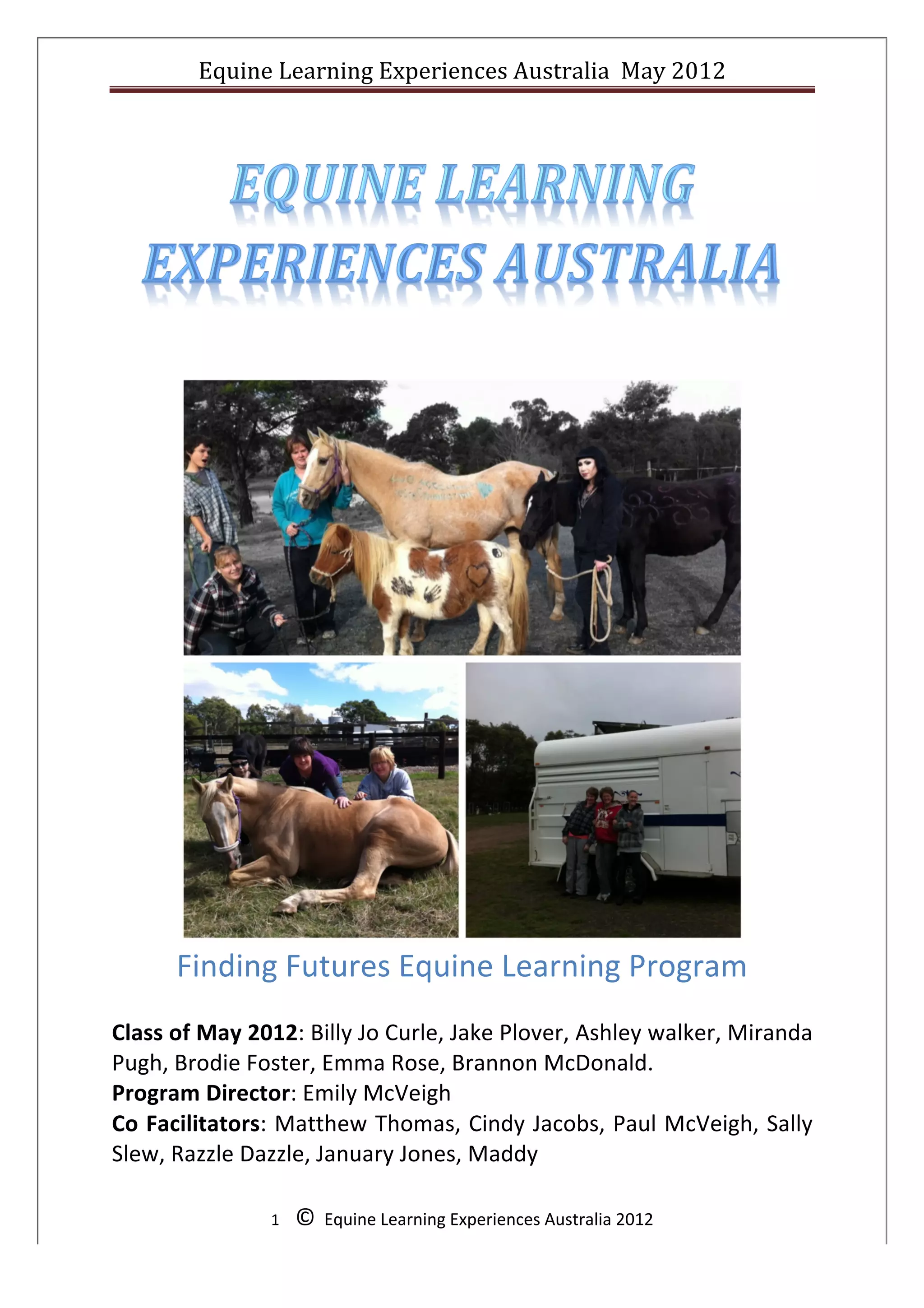 The document details the experiences of participants in the 'Finding Futures' equine learning program in Australia, highlighting personal growth and skill development over ten weeks. Participants, including Billy Jo Curle and Jake Plover, reflected on how activities with horses enhanced their self-awareness, leadership skills, and emotional understanding. The program emphasized the importance of authenticity, teamwork, and the therapeutic bond between humans and horses.