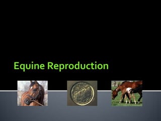 A mare is a female horse aged 3 or older. A mare's reproductive abilities begin to decrease at age 16. Foaling occurs after an 11 month gestation period. Mares experience seasonal estrous cycles controlled by exposure to light and melatonin levels. Stallions reach puberty at 15 months but are usually not used for breeding until age 3. Sperm production takes 57-60 days. Foals are born front feet first and must drink the mare's first milk, called colostrum, within 30 minutes. Proper nutrition and vaccination protocols are important for mare and foal health during and after pregnancy.