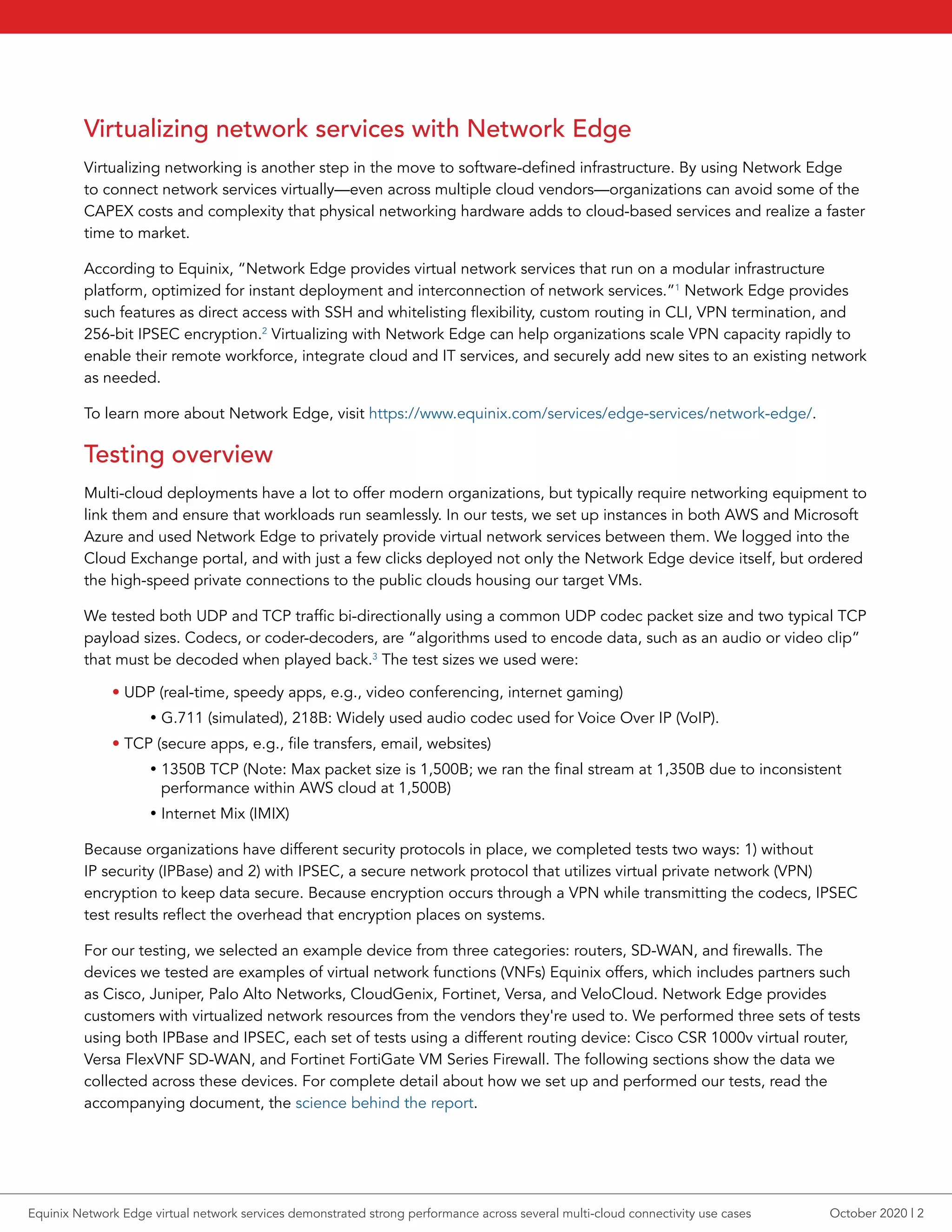 Equinix's Network Edge virtual network services effectively integrate infrastructure across multi-cloud platforms, showing strong performance in various connectivity use cases, specifically supporting up to 2,591 VoIP sessions with minimal packet loss. The solutions demonstrate high throughput capabilities, simplifying cloud infrastructure by eliminating complex physical networking. Additionally, the ease of deployment enhances business agility and accelerates time to value, with organizations benefiting from decreased costs and improved network management.