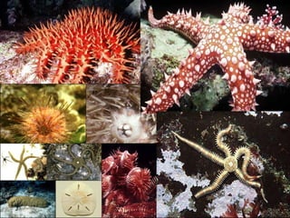 EQUINODERMS equinoderms: delgrec echinos “espines”, i derma “pell”. Nom d’unes 6000 espècies marines amb la pell coberta d’espines. Es caracteritzen per tenir una simetria radial en la qual els òrgans es disposen radialment al voltant del centre de l’animal. Pertanyen a aquest grup animals com l’estrella de mar , l’eriçó de mar , el cogombre de mar , l’ofiura , el dòlar de sorra i el lliri de mar , entre d’altres.