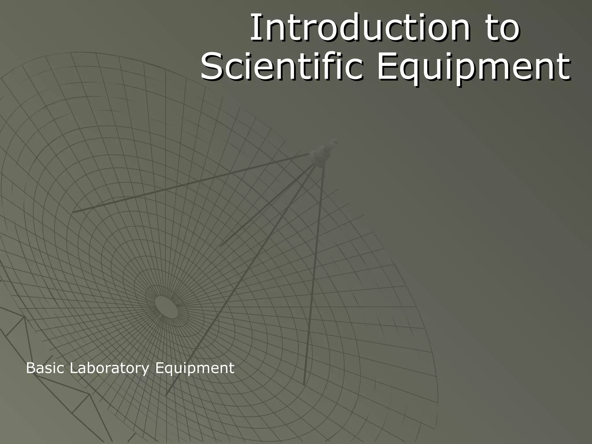 This document provides an overview of basic laboratory equipment used in scientific experiments. It describes various pieces of equipment such as beakers, Bunsen burners, cover slips, dissecting tools, microscopes, petri dishes, pipettes, rulers, safety goggles, test tubes, balances, flasks and more; and briefly explains the purpose or proper use of each item. The goal is to familiarize readers with common laboratory tools and equipment.