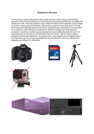 I will be using a Canon 600d camera, Velbon DV7000 tripod, SD card to store footage, and a computer to edit the film opening. The camera and tripod will provide reliable and steady footage. Footage will be uploaded to the computer and edited in Adobe Premiere Pro CS5.5, which the filmmaker has experience using for preliminary films.