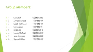 This presentation discusses the components and equipment of computers. It is presented by 8 students: Samiullah, Amna Mehmood, Laraib Mehmood, Saman Jaan, Zaid Butt, Sundas Shafaizi, Isma Mehmood, and Usama Iftikhar. The major components of a computer discussed are the processor, main memory, secondary memory, input devices, and output devices. Examples of equipment include the monitor, keyboard, printer, and microphone. The functions of the CPU, RAM, hard disk, and common input/output devices are also summarized.