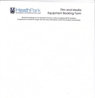 This document is a booking form for film and media equipment from M Heathpark. It lists the various cameras, lenses, lighting, audio, and camera support equipment available for booking, along with the student's name making the booking and contact information. Bookings are for a maximum of 24 hours on weekdays unless otherwise arranged. The student is reminded to contact staff if equipment is needed for longer than the return date listed on the form.