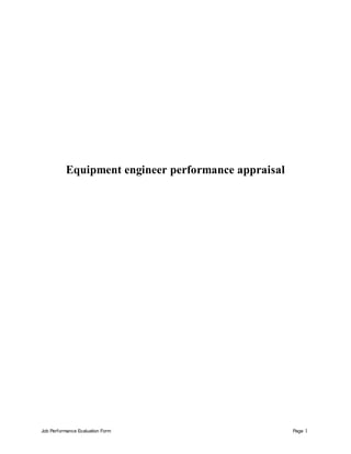 This document provides information and resources for conducting a performance evaluation of an equipment engineer. It includes a 4-page sample evaluation form with rating scales for evaluating an engineer on various performance factors. It also lists phrases that can be used in evaluations and the top 12 methods for conducting performance appraisals, such as management by objectives, critical incident method, behaviorally anchored rating scales, and 360 degree feedback. The goal is to help managers formally assess an engineer's performance and provide constructive feedback for development.