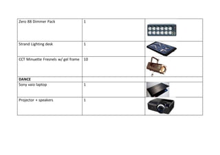 This document lists equipment inventory for three rooms - Drama, Dance, and Hall. The Drama room contains equipment for lighting and audio including a laptop, projector, speakers, dimmer pack, lighting desk, and stage lights. The Dance room has equipment for video, audio, and lighting such as laptops, projectors, TVs, DVD players, speakers, mixer, and CD players. The Hall room includes computers, projectors, passive and powered speakers, amplifiers, mixers, CD players, microphone receivers, dimmers, and a lighting desk. A piano is also shared between the three rooms.