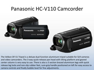 The equipment list includes a Panasonic HC-V110 camcorder, a Velbon DF-51 tripod, and a Velbon DL-11 dolly. The Velbon DF-51 tripod is an aluminum tripod suitable for cameras and camcorders, featuring a 3-way quick release pan head, tilting platform, geared center column, 3-section braced legs, quick release leg locks, and bubble level. The Velbon DL-11 dolly is compatible with the Velbon DF-51 tripod, with folding 2-section arms and a weight of 1.1 kg.