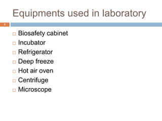 This document provides information on the maintenance and proper use of various laboratory equipment, including biosafety cabinets, incubators, refrigerators, deep freezers, hot air ovens, centrifuges, and microscopes. Key steps outlined include cleaning, monitoring temperatures, addressing issues promptly, and taking safety precautions. Proper maintenance is important for ensuring reliable performance of equipment and sterile conditions.