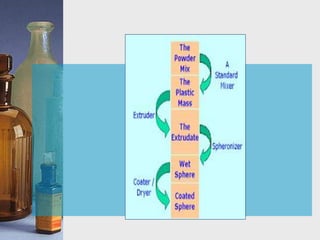 This document discusses different techniques for pelletization, including extrusion-spheronization, fluid bed granulation, spray drying, and spray congealing. Extrusion-spheronization involves extruding the material through a screen to form rods, which are then rounded into spheres using a spheronization machine. Fluid bed granulation coats particles in a fluidized bed with sprayed binding liquid. Spray drying and spray congealing involve spraying melted or dissolved formulations into cooled air to form solid spheres.