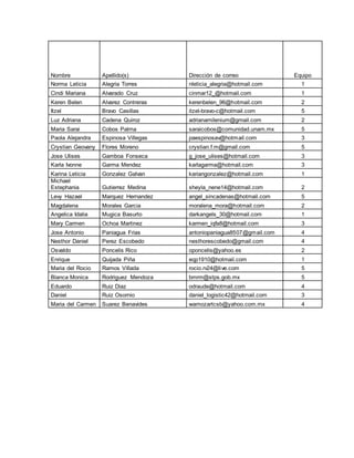 This document contains a list of names, email addresses, and teams. There are 25 entries total, with each entry listing a person's name, email, and a number corresponding to their team. The numbers 1 through 5 are used to indicate the five different teams.