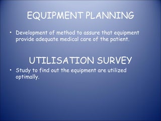 The document discusses guidelines for medical equipment planning in hospitals. It outlines the roles and responsibilities of the hospital administrator, architect, and medical equipment planner in determining equipment needs based on the scale and specialties of the hospital. Equipment is categorized as built-in, depreciable, and non-depreciable, with examples provided. Key drivers for equipment planning include need, technology, service, price, and training. Guidelines are prescribed by organizations like USFDA and certifications like ISO are important to ensure equipment quality.