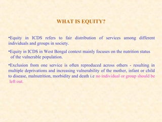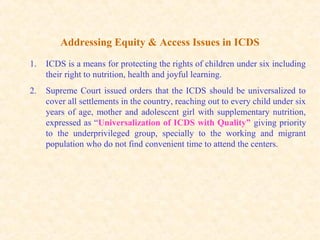 The document discusses equity and access issues in India's Integrated Child Development Services (ICDS) program and proposes ways to address them. It notes that ICDS aims to protect children's rights to nutrition, health and learning. However, some groups face barriers in accessing ICDS services due to cultural, religious or household factors. To promote equity, ICDS must be universal and reach all children, with a focus on the most vulnerable populations. Gaps in both supply of services and community demand must be identified through discussions with local communities and analyses of coverage data. Prioritizing outreach and improving information sharing can help address exclusion and ensure ICDS benefits all children.