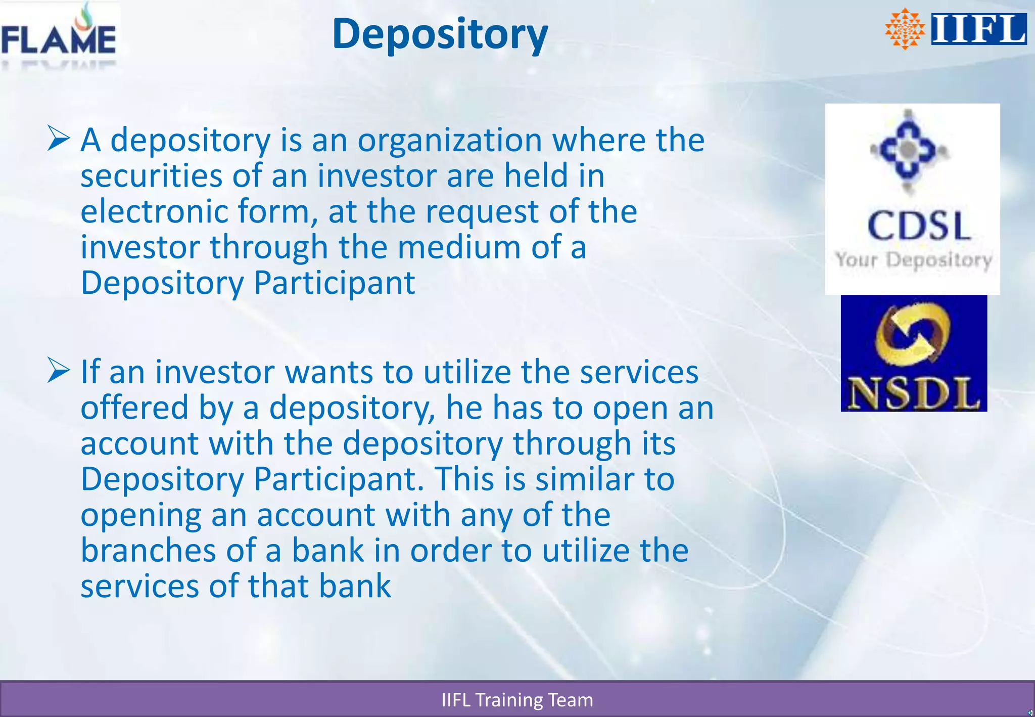 A depository holds securities electronically for investors through depository participants like banks and brokerages. Dematerialization converts physical shares into electronic form. Depository participants act as intermediaries between depositories and customers, maintaining account balances and facilitating transactions. The two main depositories in India are NSDL and CDSL, regulated by SEBI. Depositories provide safe custody of securities and allow electronic transfer of shares without physical movement, similar to how banks hold funds electronically.